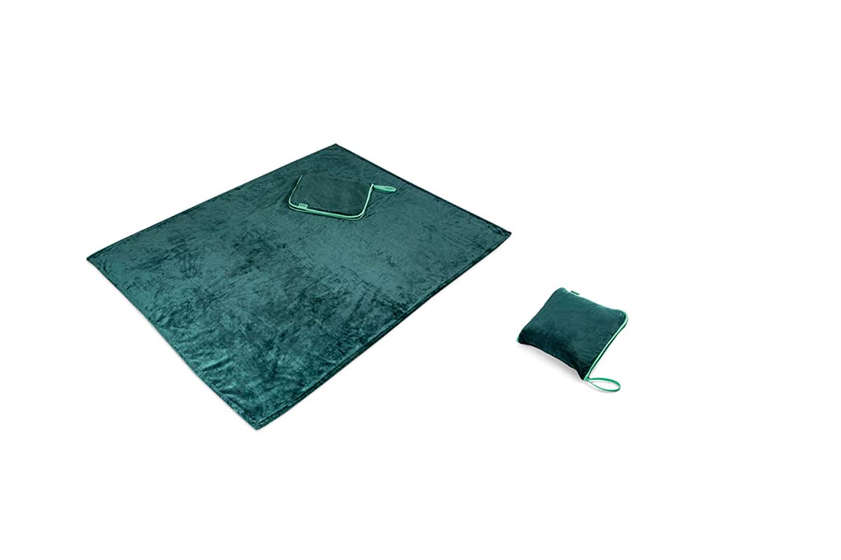 Die Reisedecke in Emerald-Grün: Dank Reißverschluss kann sie auch als praktisches Kissen verwendet werden. 100 % Polyester-Microfleece.