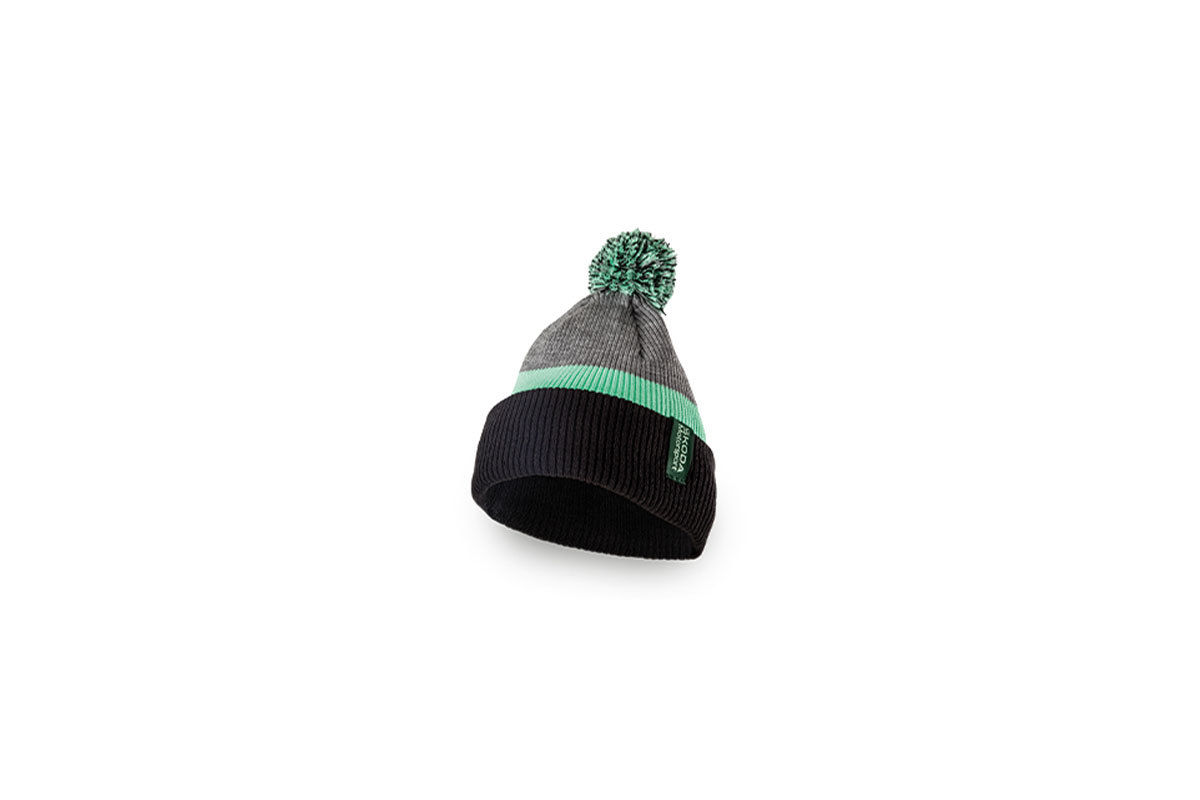 Strickmütze (100 % Acryl) im Motorsport-Design mit Streifenmuster in Grau, Electric-Grün und Schwarz sowie mehrfarbigem Bommel.