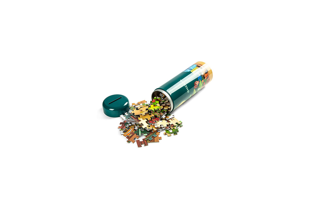 132-teiliges Puzzle mit buntem Weihnachtsmotiv. Die Aluminiumhülle kann z. B. auch als Spardose für Münzen und gefaltete Geldscheine genutzt werden.