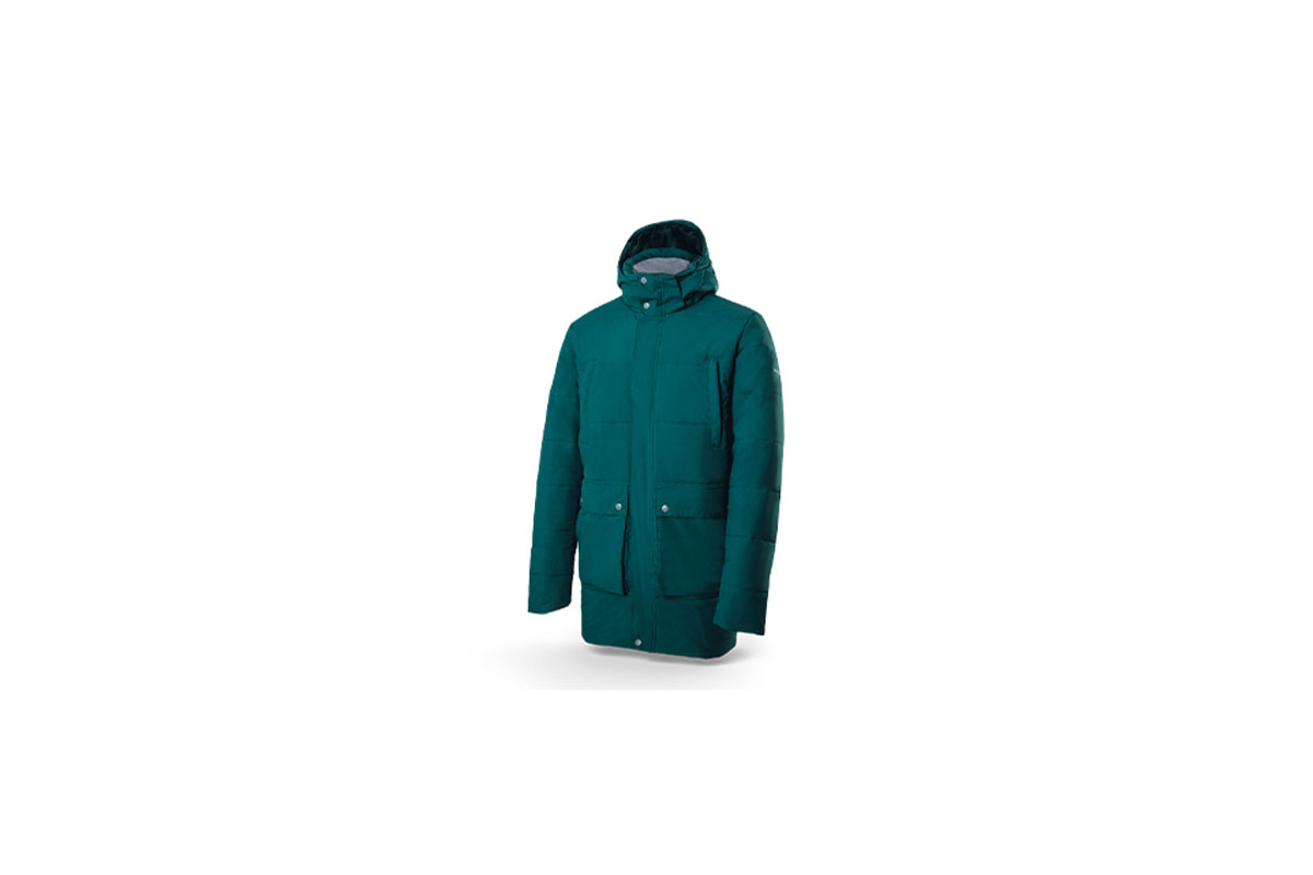 Steppmantel in Emerald-Grün mit abnehmbarer Kunstpelzkapuze und einem inneren Halskragen aus angenehmem Samtmaterial und elastischen Ärmelabschlüssen in Grau. 100 % Polyester.